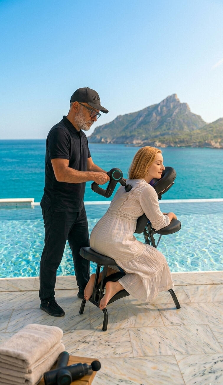 Being a Dry Service (Oil-Free), our intervention has zero impact on your environment. We do not require special preparations from you nor do we cover furniture with plastics. We only need a minimum space for our ergonomic chair or technical table. Absolute hygiene in your Villa, Yacht, or Hotel Suite.Compromiso de Privacidad y Rigor. Privacy & Rigor Commitment.Operamos bajo los más estrictos estándares de discreción profesional. Cada "Reset" se ejecuta siguiendo un mapa anatómico detallado, garantizando que cada impacto de la unidad de percusión tenga un propósito funcional de recuperación.